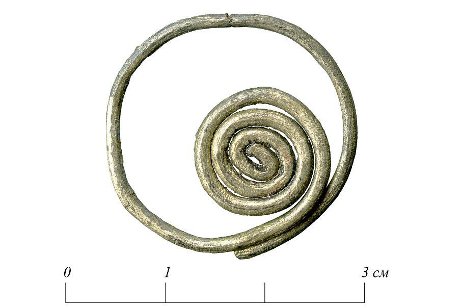 С-образное спиральное височное кольцо, предположительно из серебряной проволоки.
