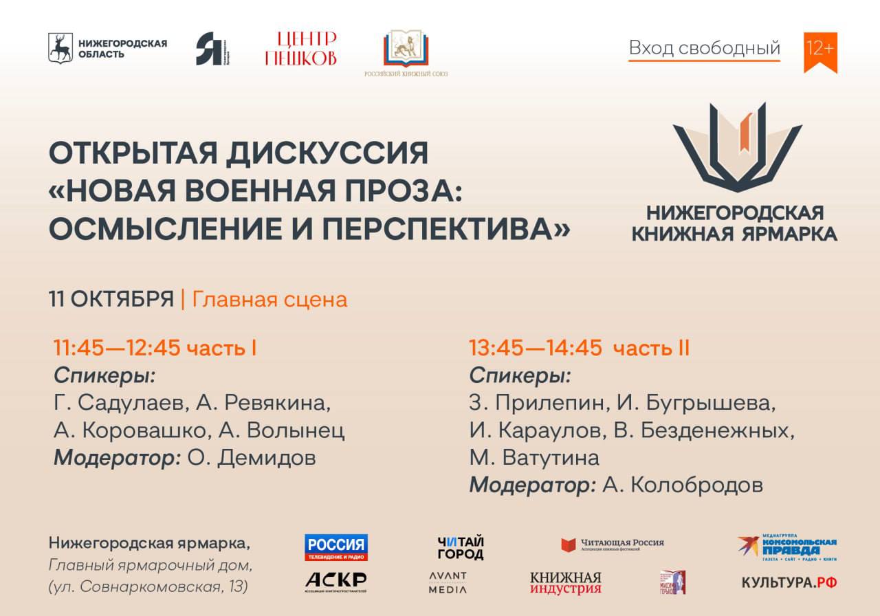 11 октября на центральной сцене Первой нижегородской книжной ярмарки состоится открытая дискуссия «Новая военная проза: осмысление и перспектива». Первая часть встречи пройдет с 11:45 до 12:45.